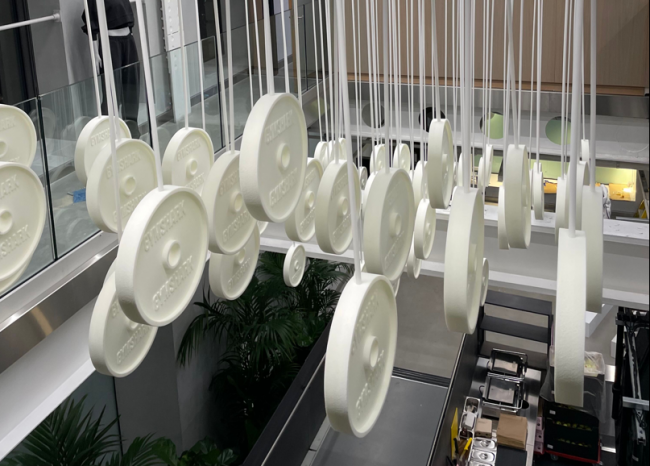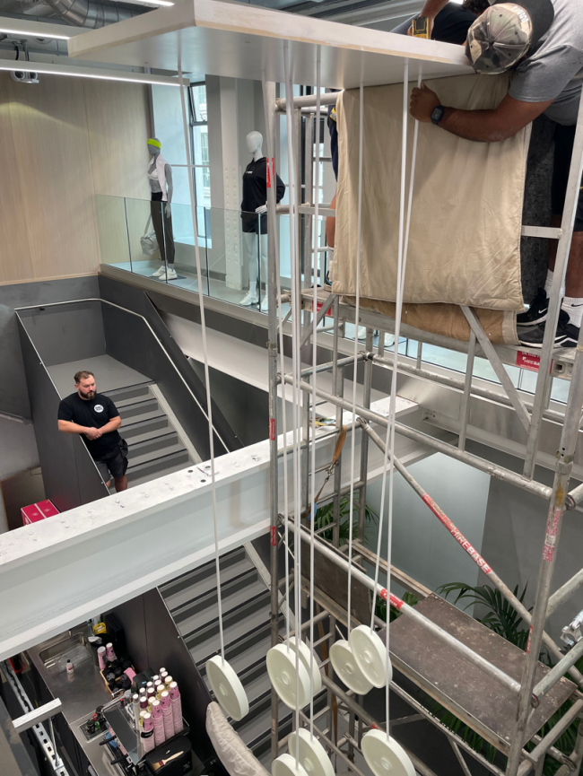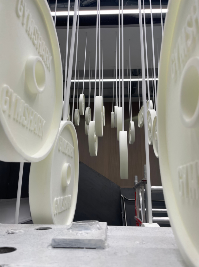 Early plans revolved around the having of mock weight plates being suspended in cascading fashion over the staircase.