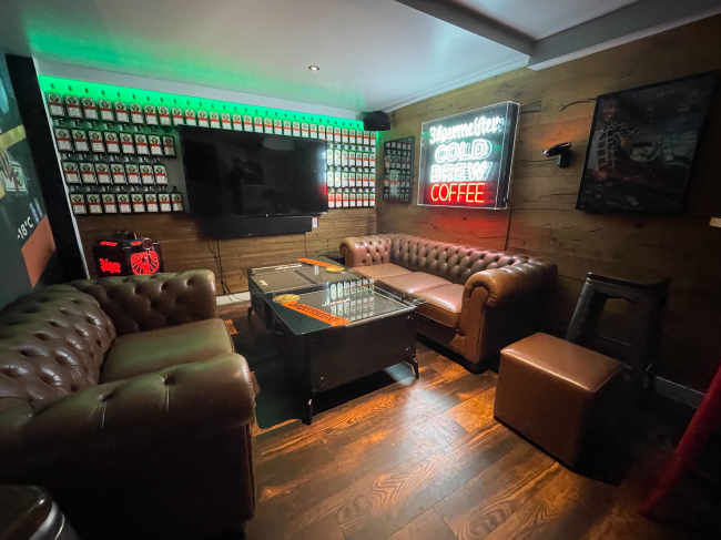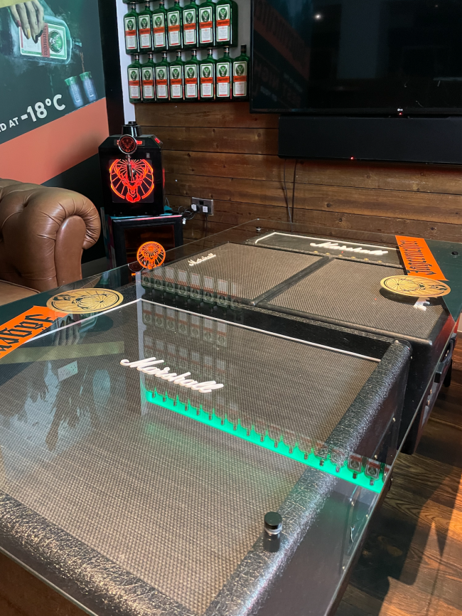 The result was creating a booth with a home bar feel. The coffee table was a result of workshop experimentation – we approached Marshall who kindly donated the amps and speaker heads. We created a bespoke wallpaper to make the room cosier and made use of existing assets.