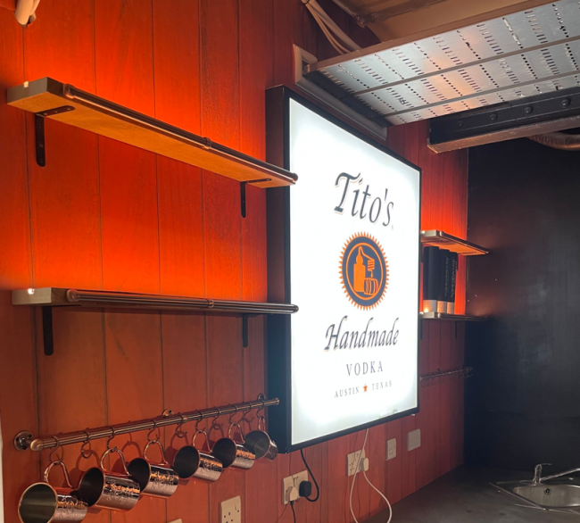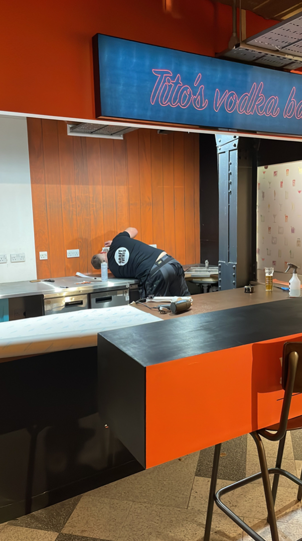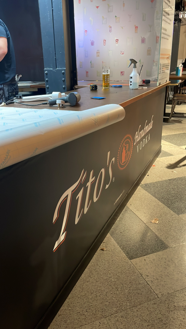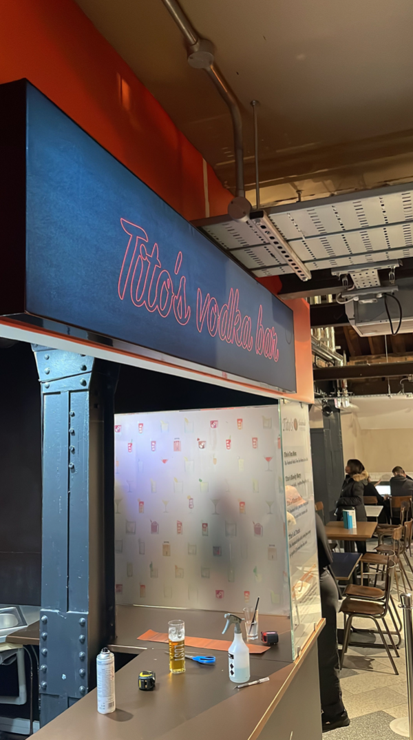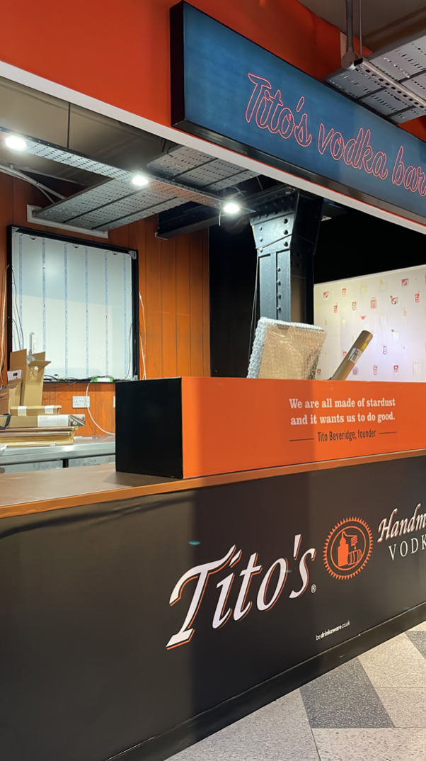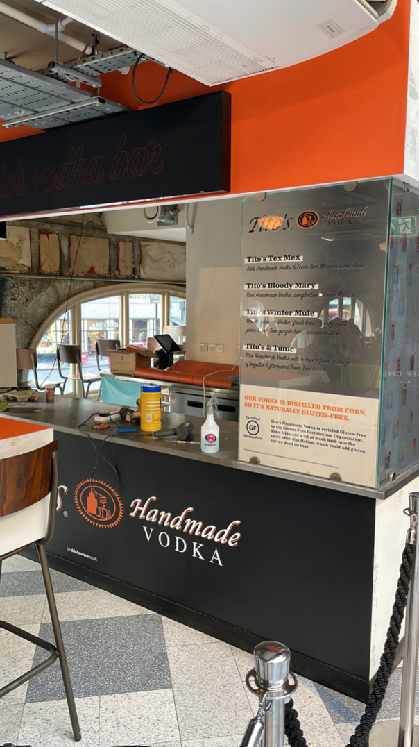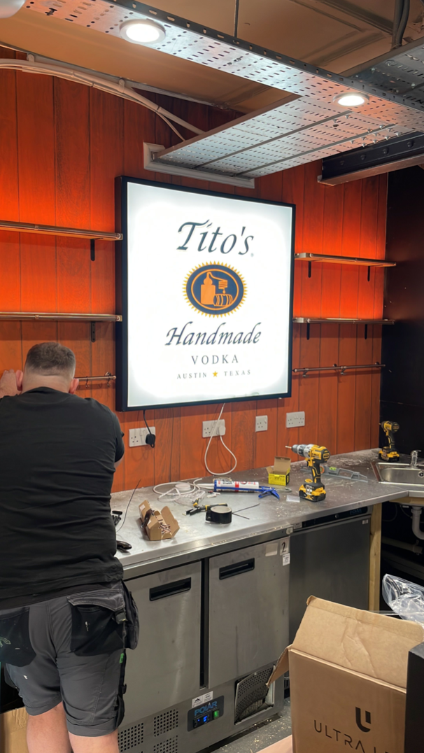 When Titos had the opportunity to take residency at a popular bar in a bustling food market they enlisted us to carry out the transformation. As it was largely a rebranding exercise we were able to help keep cost down by carrying out a remote site visit. With the Market open to the public during the install time the team had to work quickly and efficiently, getting the transformation completed within a day and a half and in time for the Friday night crowd.